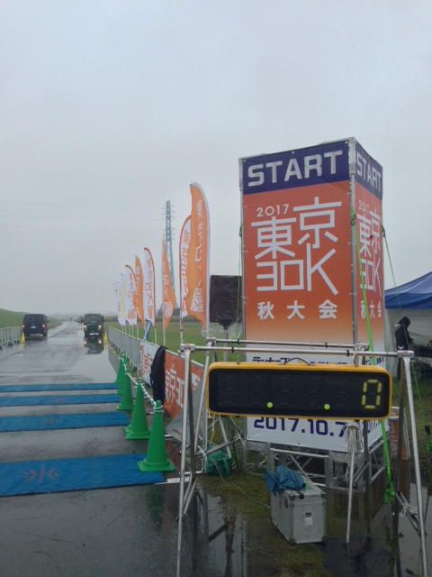 空いているうちにトイレを済ませ、車内でやり過ごす。会場は雨でぐっちゃぐちゃなので、テントは使用せず。15分前になり、ジョグりながらスタート地点へ。