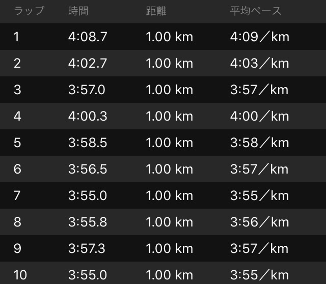 入りの1km目、体感ではキロヨンぐらいのつもりなのに、まさかの4'09emoji 誤差かと思いきや、どうやら僕のガーミンだけではなさそうだった。5kmまでペースが安定しなかったが、6km以降はいい感じになってきた。