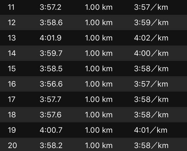 入りの1km目は、3:59。キロヨン集団は7名位か。ふくらはぎの張りを気にしながら、淡々とラップを刻んだ序盤。追風の影響はあったんだろう(気付きにくい、というランナーあるあるケースemoji)。