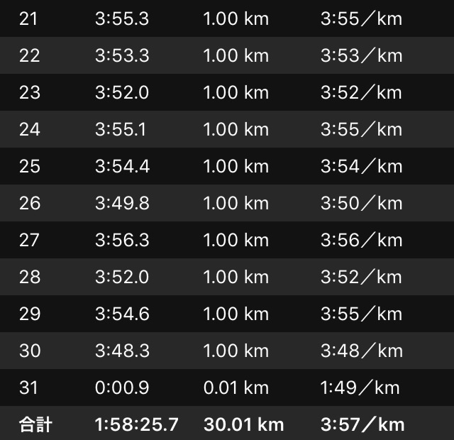 やはり、練習は嘘をつかない、正直だ。30km走を順調にこなせておらず、レースのアドレナリンをもってしても、練習不足を補えなかった。