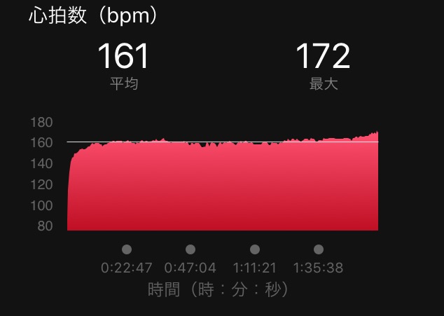 平均心拍数は166で過去と比較して大体そんなもんだが、最大が173どまり。ラストスパートできていないので、ゴールに向けて心拍が上がらず、ほぼ横ばい、いや、むしろ若干落ちている。