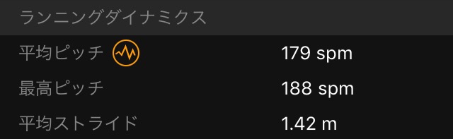 ピッチ数は179、ストライド142cm。ほぼベストな結果といえる。