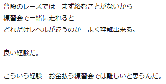 Fさんは、更にブログで『特にTomさん、超絶ナイスランです。ほんとに素晴らしい走りで、速さだけでなく「強さ」も感じました』と評してくれた。