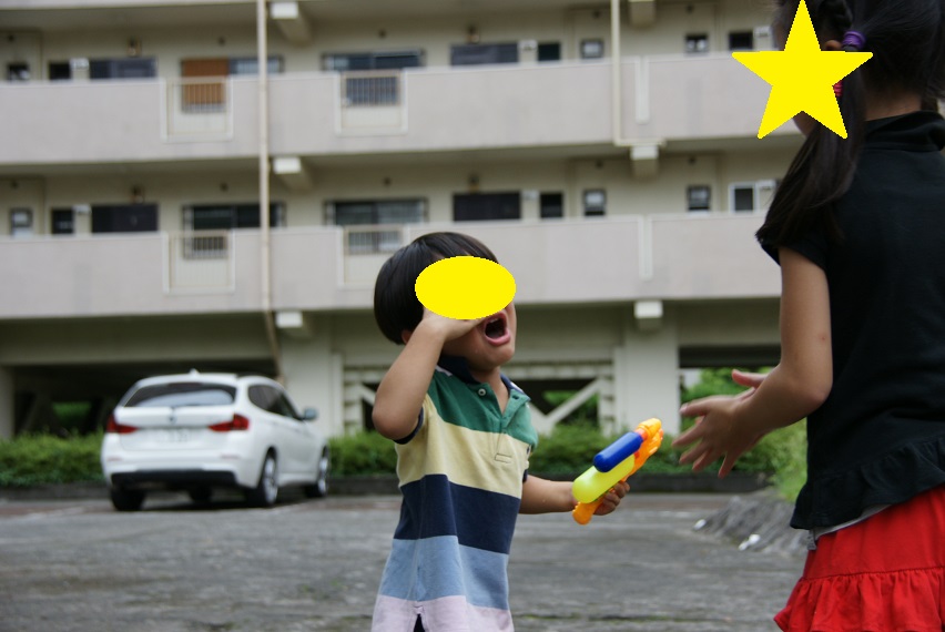 水鉄砲を娘にとられ、泣き叫ぶ息子・・・。