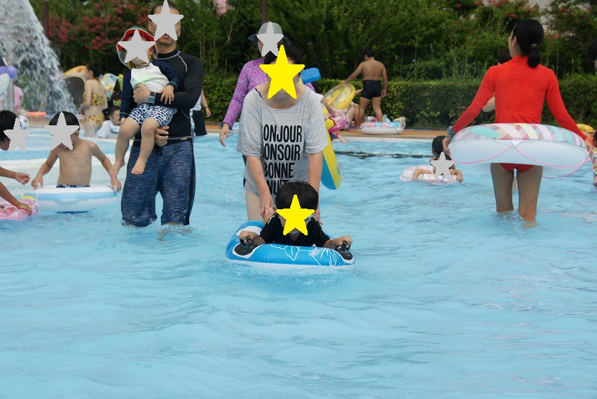 息子は母親に。娘とは対照的で、あまりプール好きじゃない。テンション低いし・・・。