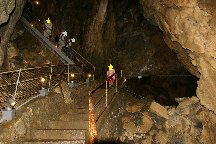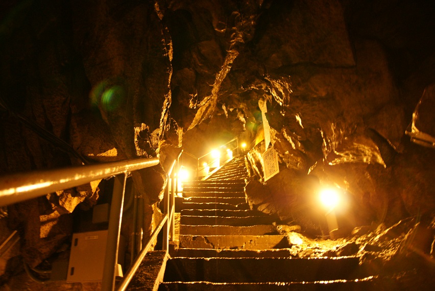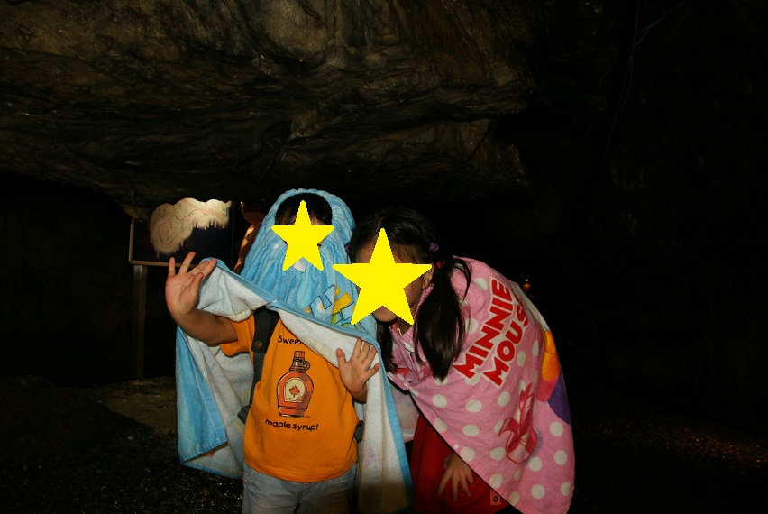 中は肌寒いので、プール用のタオルが大活躍。フラッシュで撮影するとそっけなくなるけど、薄暗く、水滴で濡れた岩が灯りを反射する様は、なかなか綺麗。