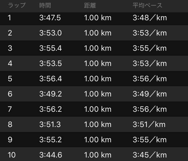 大事な入りの1km目、3'48。お、無理なく脚が動いている。