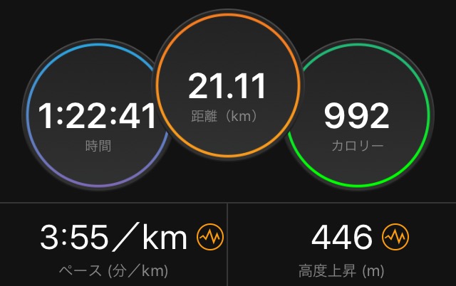 ハーフの設定ペース、3'55。ポケモンハンターがうじゃうじゃいて走りにくく、4, 5km目のラップがこぼれる。