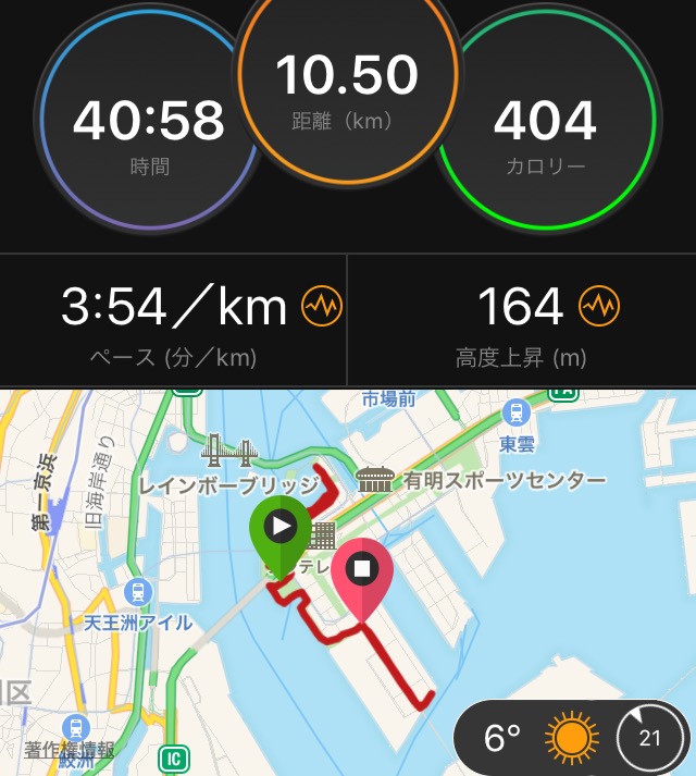 結果、10km通過は39'01で、3'54。設定はクリアできなかった、というより敢えてしなかった。向かい風に抗って体力が消耗するのを避けた。