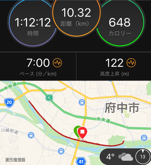 今朝は荒川河川敷へ行き、10kmのEペースとジョグ合わせて13.4km。安定の強風で、向風時はEペースの下限4'45前後、追風時は上限4'30前後。気持ちよく走り納め。