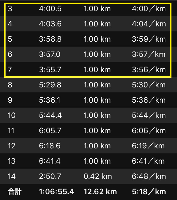 向風を正面からもろに食らって、4'03.6。しかもなんだか蒸し暑い。さすがに焦りを感じて、意識してペースアップして3'58.8。