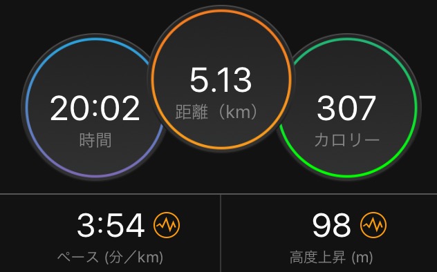5kmは18'35、平均3'43。そのまま20分走って5.4kmほど。入りの1km目が速すぎた。全体を通して設定をオーバーしないでまとめたいところ。