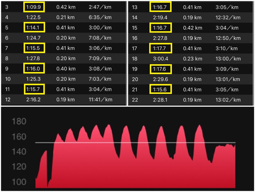 2本目、ほぼイーブンペースで走れて74秒。3本目、ラスト100mぐらいがきつくなり、頑張らないと厳しくなり始める。75.5秒で、ちょいオーバー。