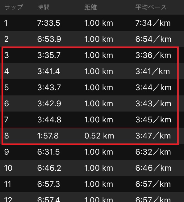 入りの1km目、追風区間でがっつりタイム稼ぎをして3'36。ちょっとやり過ぎた。その後は、ほぼ設定通りの安定したペースで走り切れた。