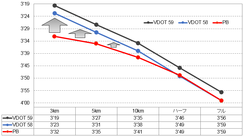 以前記事にした通り、ハーフとフルから導き出される僕の現VDOTは58。