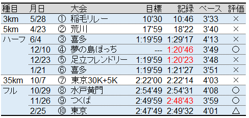 ハーフ、30km、フルそれぞれでPBを更新できたので、総評としては効果的な練習が積めたと思う。一方で、シーズン中の目標のひとつだった、ハーフの80分切りは未達なわけで、ハーフに特化した練習は課題が残った。