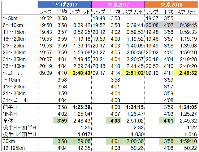 PBのつくばと昨年の東京とを比較し、今年の東京のレース展開はどうだったのだろうか。5km毎のラップなどなどのデータがこちら。
