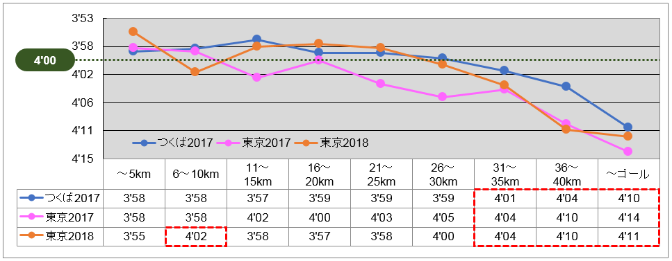 青に比べ、オレンジが、後半からより急角度で下降を辿っている。そう、決定的なのは30km以降の粘り。つくばの通過タイムと2秒しか違わないのに、ズルズルとペースダウン。