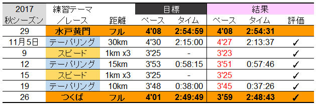 今シーズン秋。9月からのロング走積み上げが不調に終わり、調整レースの水戸ではタイムこそサブ55だったが、内容はイマイチ。