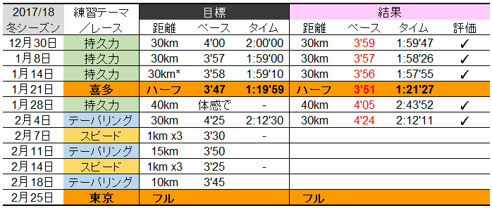 年末から3週連続の30km走は、全てキロ4アンダーで走った。1月14日はハーフ向けに20kmのペース走+10km粘るというハイブリッド走とはならなかったが、結果としてPBになった。