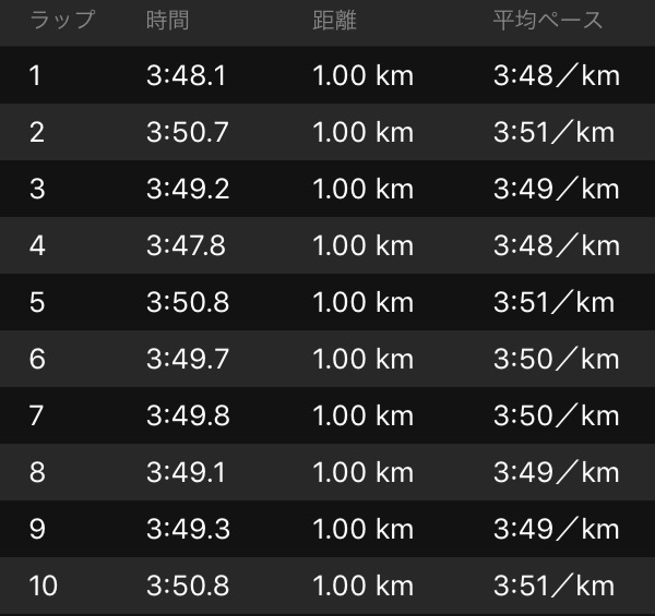 6km以降、3'49台を連発。風の影響がないと、ペースが乱れることもなく、楽に走れる。