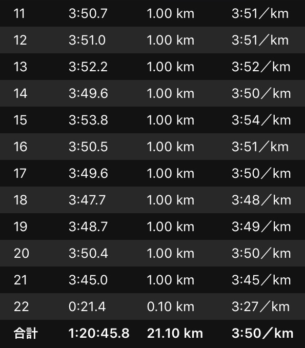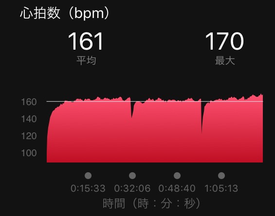15km通過が57'32で、痛恨の2秒オーバーemoji 心拍数はまだ160前半で余力があるのに、もったいないことをした。