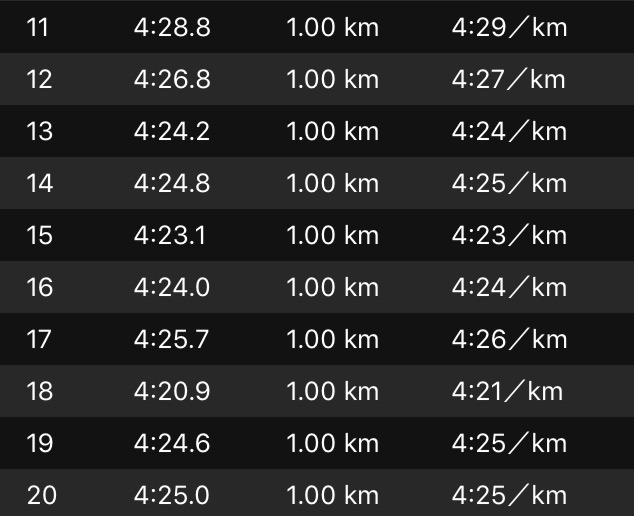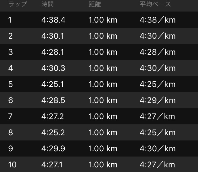 ほぼほぼイーブンラップ。キロヨン設定で、こういう風に、マイナス2~5秒で走れたら楽しいだろうなemoji