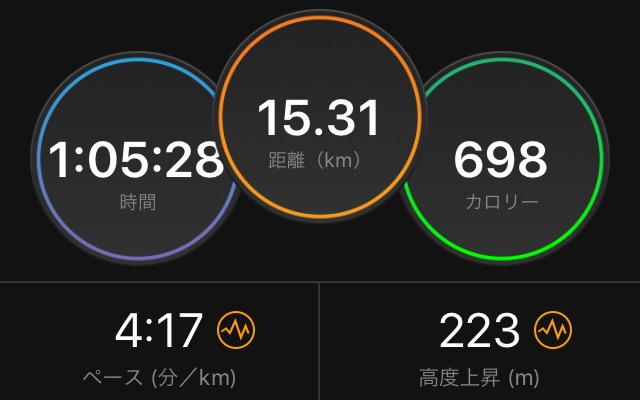 15kmが近づいてくると、あと5km頑張ってみようか、という気持ちになる(笑)。1:01:06、ギリギリ4'04。