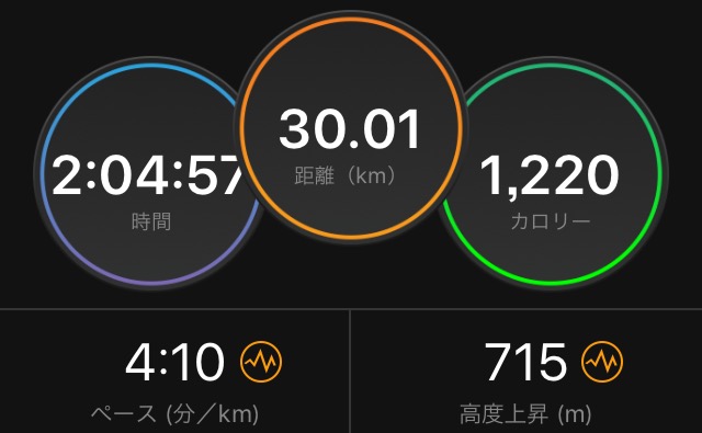 プラン通り、30km走、ペース設定4'10。なんとかクリア。遅いけど、速報(笑)。