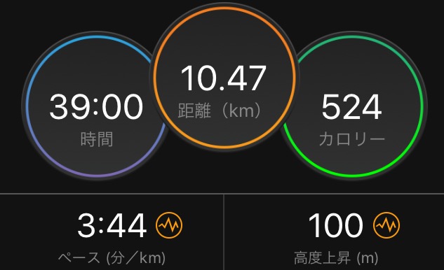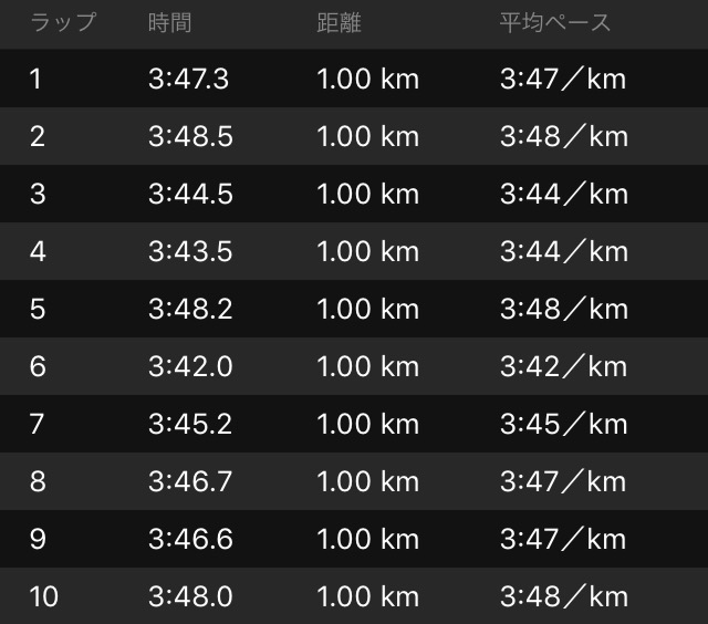 入りは3'47。混雑を避けてジグザグ走はしなかったので、まぁまぁ。5kmまではほぼ設定どおり。