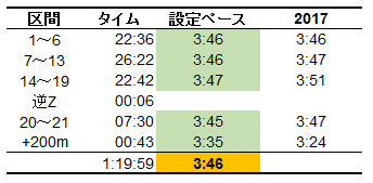 (21.2kmで計算しているため、全体の設定ペースは3'46)