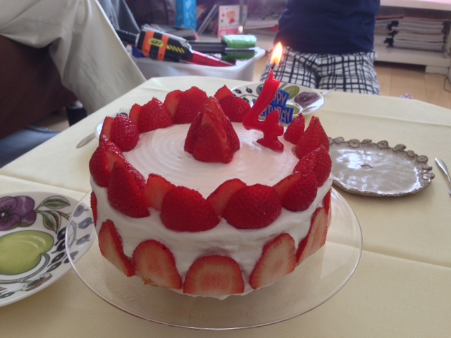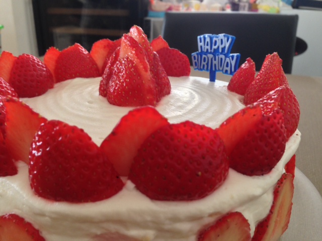 両親も交えてお祝い。ケーキは息子の好きな苺をたっぷり使ってシンプルに。ナッペとデコレーションがキレイに仕上がったemoji