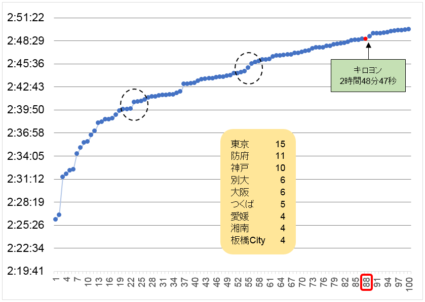 前年とその前、100位のタイムが2:49:08だった(詳しいデータはこちら)。そんなことから、サブ50なら恐らくランクイン、キロヨンカットできれば間違いなくランクイン、と思ってやってきたこの2年間。