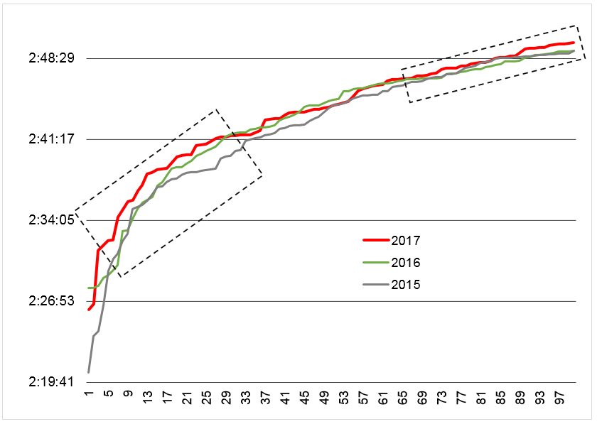 ① 2015と2016ともに2:49:08だった100位のタイムは、2017は2:49:53。やはり加齢の影響は少なからずあると思われる