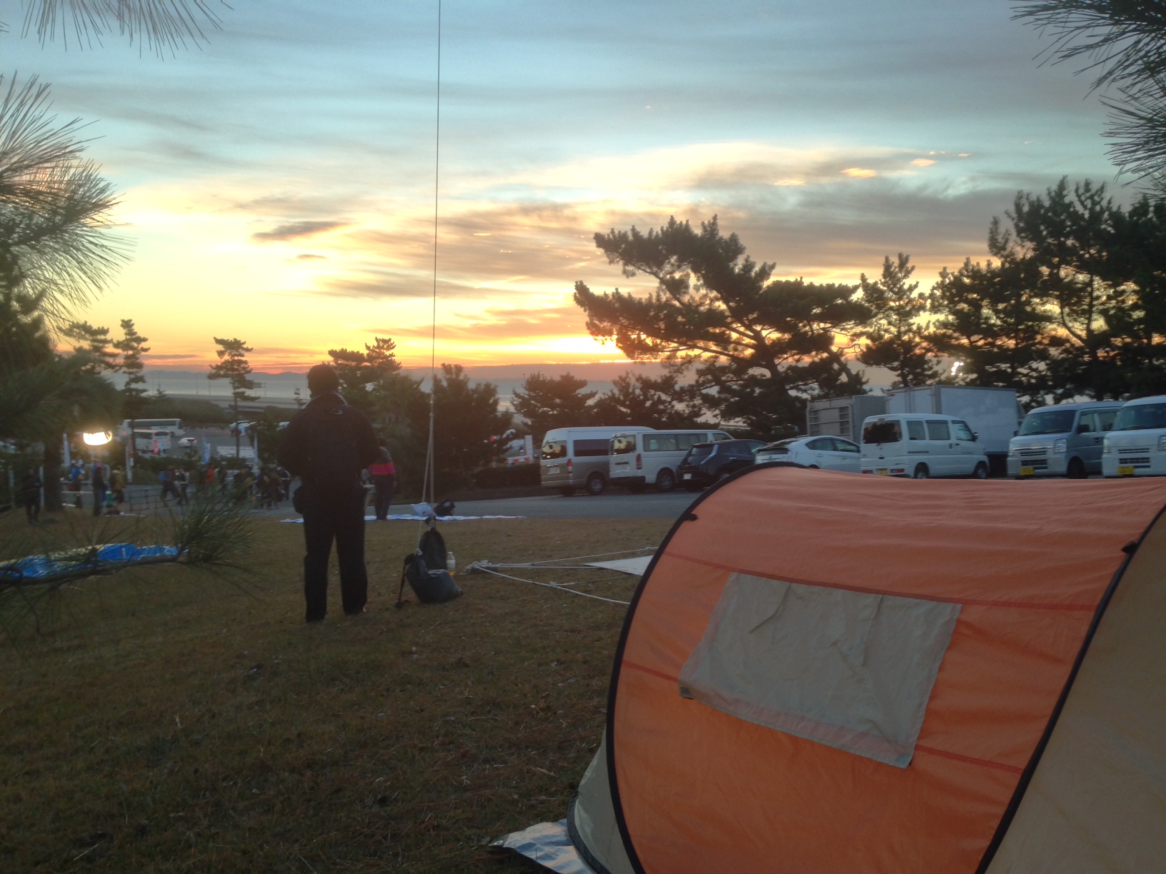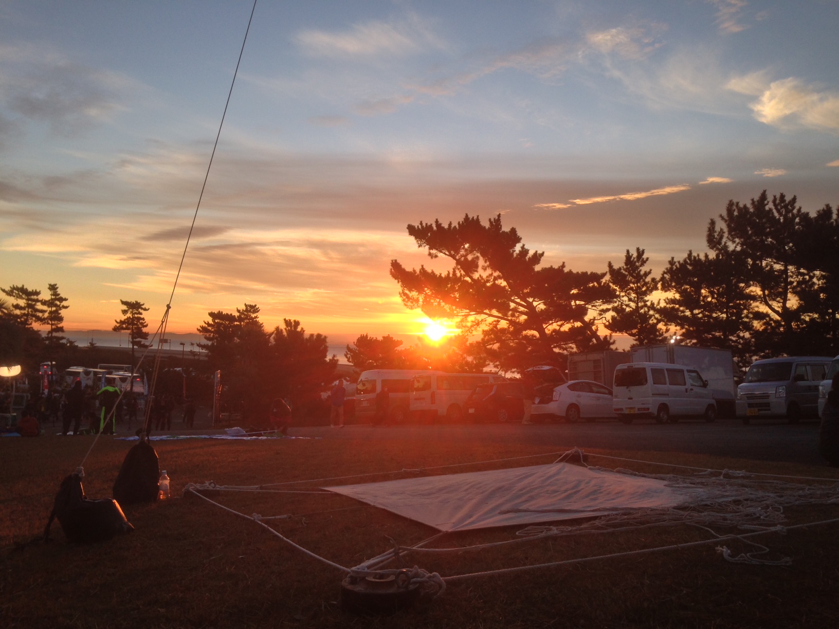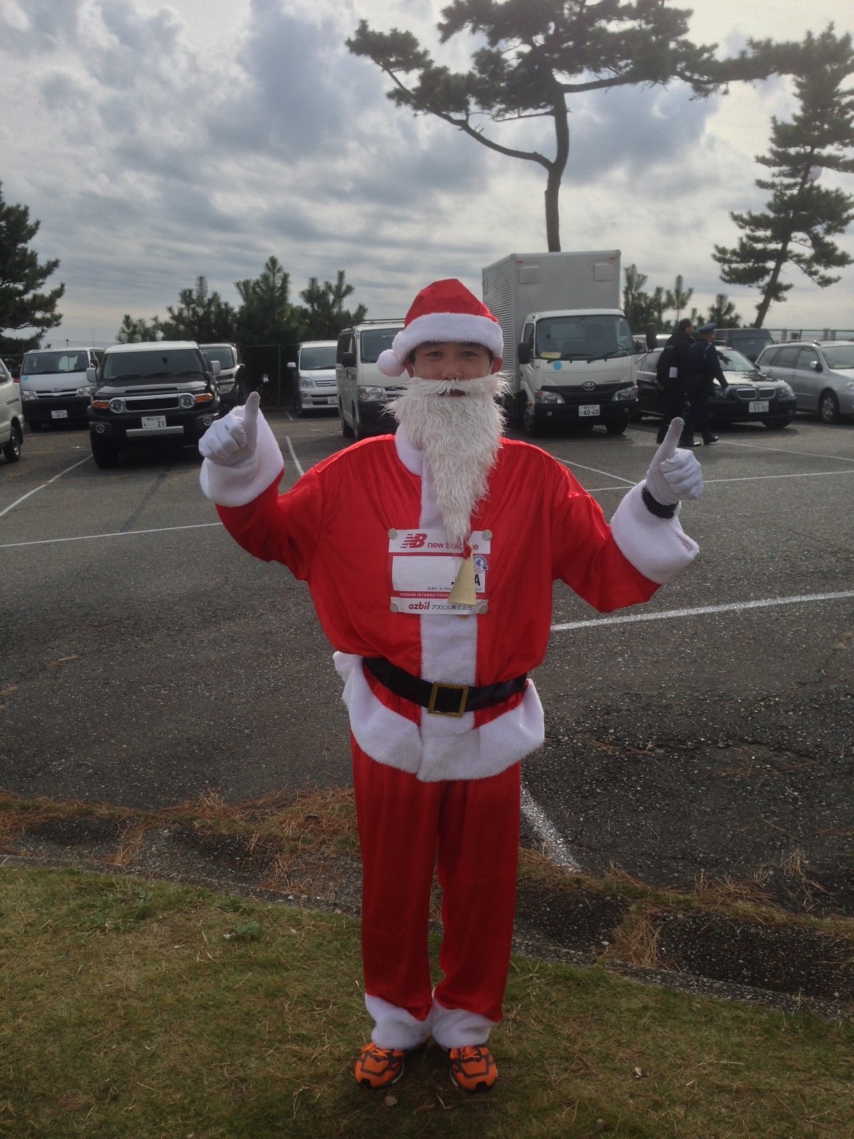 08 December 湘南にサンタがやってきた!? 日曜日、5年連続参加となる第10回湘南国際マラソン走ってきました。 湘南は初マラソン、初サブスリーの思い出深いレース。これまで11月3日に開催されたこの大会、今年は12月7日。自己ベストとなる53分台を出し完全燃焼できたつくばマラソンの2週間後なので、ファンランとしてサンタクロースの格好で走りました。 無謀にも、そのフル装備仕様の格好でサブスリーを目指すも、残念ながら3時間3分28秒。給水スタッフ、ボランティア、沿道の多くの方々から大声援を受け、僕としても楽しく走ることができ、また多少なりともエンターテイメントを提供できたのであれば、やってよかったと思います。まぁ、走っている最中は激しく後悔しましたが(笑)。 それでは、レポートです。 【 前日 】 当日移動も可能ではあるものの、そうすると3時頃の起床、2時間以上の移動となるので、毎度のことながら前泊。小田原のビジネスホテルに夕方チェックインした後、ゲン担ぎで、餃子の王将にて5年連続、同じようなメニューの食事。今回は餃子2枚セット+ミニチャーハン。 ホテルに戻る前に朝食の買い込み。近くのコンビニ2店でバナナが売り切れていた。店員さんからすると、年に1回起きるこのような状況に???な気分なんだろう。スーパーでゲットできたので一安心。黒いかたまりは胡麻のおはぎ。 【 当日 】 4:30頃起床。朝食を食べ、熱いコーヒーを飲み、5:50の小田原発の電車に乗り込む。それにしても冷え込んで寒い。この時間なら全然座っていける。15分ほどで二宮駅に到着。そこから会場までは惜しまずタクシー。いつもなら居合わせた人と乗合で行くけど、今回は前客が3人組、後客が2人組。自分から声をかけると便乗させてほしいとの意思表示になるので気が引け、一人で乗車。それでも1,000円ちょっとなので、シャトルバスに並ぶ時間を考えたら効率的。 【 スタートまで 】 6:30頃会場入り。いつものようにテント設営。赤飯おにぎりとバナナ2本を食べ、トイレが空いているうちに済ませておく。朝日が眩しい。 とにかく風が強い。ペグで止めていても地面が柔らかいため、強風にあおられテントが吹き飛ばされそうになる。軽くアップしストレッチ。そして、仕込み。ドンキで買ったサンタのコスチューム。もちろん小さい子供のために家族行事用に購入したわけだけど、実は4年前の江東シーサイド・ハーフマラソンで着用したことがある。前日に東京マラソン主催のハーフを当時のPBで走ったので、ファンラン。仕込みというのは、当然走るようには作られていないので、ゆったりとした袖口を安全ピンでとめたり、帽子の白いボンボンが走る際に揺れて煩わしいので、これも安全ピンでとめたり、ベルトの内側にジェルを両面テープで張り付けたり、などなど。 8時頃、Aブロックの待機エリアに移動し、少しだけアップ。ほどなくして、バイパス上のスタート位置まで移動となり、さすがにこの格好なので、遠慮してAブロック最後列へ並び移動する。すると事件発生。既に交通規制されている反対の下り車線にパトカーや消防車が次々とやってきて、消防隊員はボンベを背負っている。全く状況が分からないが、恐らくCかDブロック辺りの真横で、何かが起きていた。スターターを務める徳光さんから、「事件か事故」があったことを知らされ、警察の指導によりスタートも遅れるとのこと。徳光さんが「日曜なのに火曜サスペンス劇場が起こってしまいましたが…」というような、場を和ませるアナウンスをし、バンド演奏で間をつないでいると、突然「あと1分半でスタートします」と。ちょっとバタバタしたものの、結局5分遅れの9:05にフルマラソンがスタート。 目標は3時間をちょっと切るぐらいを目指し、ペース4'13~15のイーブンで。 【 ~10km: 42:14、平均ペース4'13 】 待っている間はすこぶる寒かったものの、走り出すと体も温まり、むしろ(こんな恰好をしているので)蒸し暑く感じた。脚が重いわけでもない。とにかく息が上がるし、喉も乾く。それでも「あ、サンタさんだ~」「サンタ頑張れ!」と、想定以上の反響で、手を振り返すと喜びの表情を浮かべてもらえて、嬉しい気持ちでいっぱいになる。 【 ~20km: 42'14、4'13 】 距離表示が?な区間もあったけど、淡々とラップを刻む。裾の白いフワッとした部分にシューズが引っかかりそうになるのが辛い。髭が鼻の穴をチロチロかすめるのが煩わしい・・・。沿道の応援は確かに嬉しいが、やっぱり走りにくいのでサンタの格好をしたことを後悔し始める。それでも、復路で待つ給水ボランティアから、「サンタさ~ん、待ってるからね!」なんて黄色い声援を受けると頑張れちゃう。 【 ~30km: 43'03、4'18 】 ハーフ地点の計測はないが、手元の時計では1時間29分台。寒くはないがサンタには白い手袋が必要だと思い、暑いのでこれも曲者。ペースも段々落ちてきた。「サンタ、メチャクチャ速いね」とか「サブスリーペースだよ」という