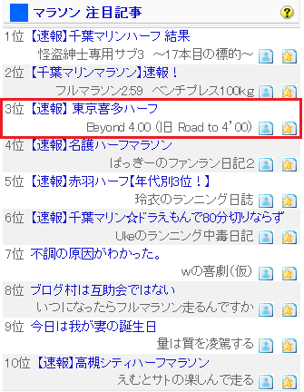いつも拝見しております。 キリ番をゲットしましたのでコメントさせていただきます。 つくばでのキロ4カット、おめでとうございます。 私はサブ3をあと10秒のところで逃してしまいました。 年明けの喜多マラソンに出場するか迷っているところです。 ご一緒出来たらうれしいです。 |