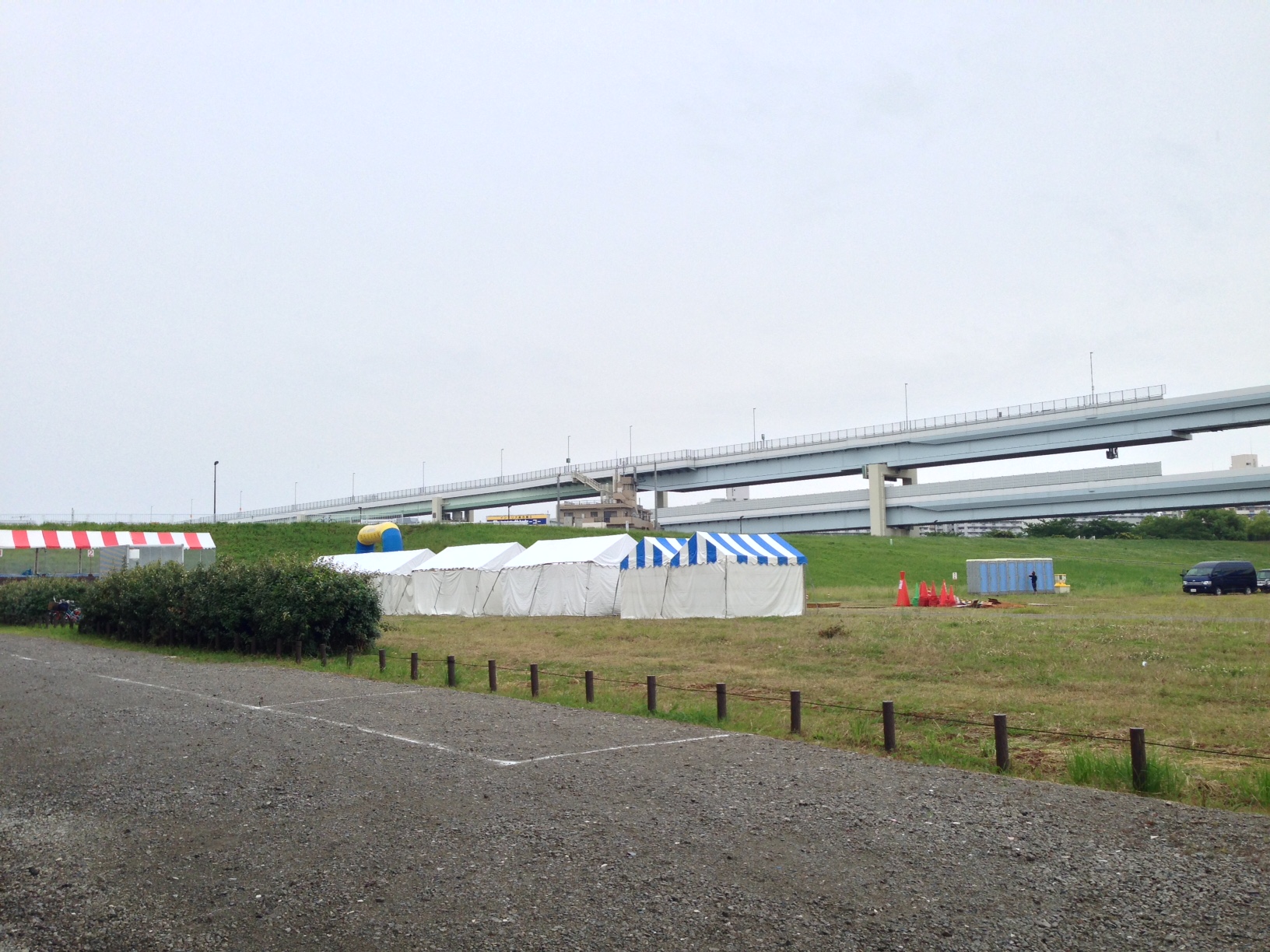ところが、車を走らせると次第に雨が強くなって、現地に着くと小雨。会場近くのコインパーキングで雨宿りしていようかと迷ったが、江北橋の真下にテントを張れば問題ないと思い、会場へ。
