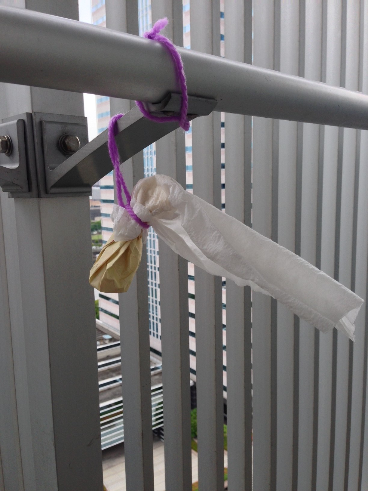前夜の天気予報では雨時々晴れ。娘がてるてる坊主を作ってくれたおかげか、朝になると雨は止んでいた。強風にあおられ、すっかりくたってしまったが、役目は果たしてくれたようだ。