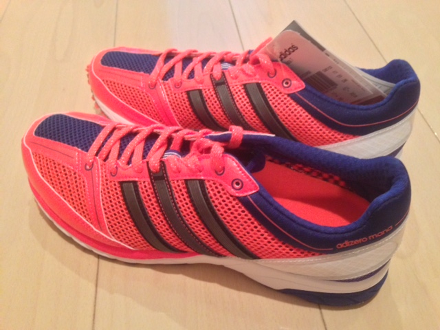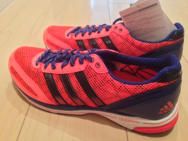 次は、同じadizero Japanがモデル変更されたadizero Japan 2(当時はベースが赤で、ヒール部分が蛍光色)。前モデルよりも若干固めでその分反発力が高まったような気がする。このシューズに替え、2012年11月の湘南国際で初サブスリー達成。以来、フルはこのシリーズ1本になり、色が変わる毎に、型落ちでセールになったモデルを何足もまとめ買いし、常にストックが3足ぐらいあるという位、愛用し履きつぶしている。