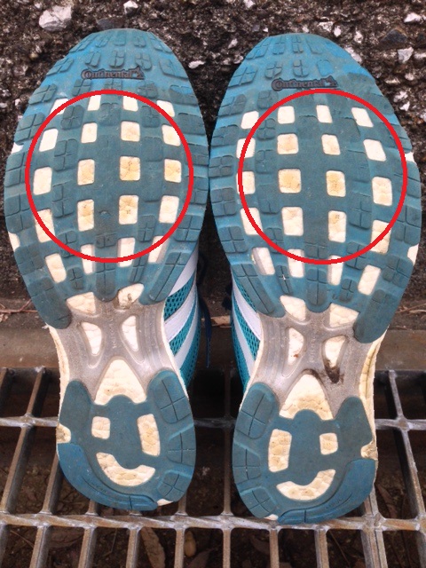 走っていると前足部が痛くなってくる。着地部分をみると大分すり減ってツルツル状態。小さな突起が完全に消滅し、すぐにでもラバーがなくなりブーストがむき出しになりそう。