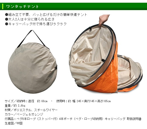 ポールを組み立てたりといった作業が一切不要で、写真のように丸まっている状態から広げるだけでパパッとできちゃう優れもの。幅 245×奥行145×高さ105cmで、中は結構広々としている。わずか5,000円でコスパ高い。もともとオレンジは一番好きな色だ。