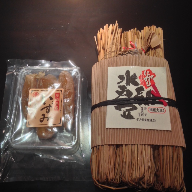駅構内で、家族へのお土産をゲット。僕以外、納豆は大好きだ。干しイモは妻の好物。