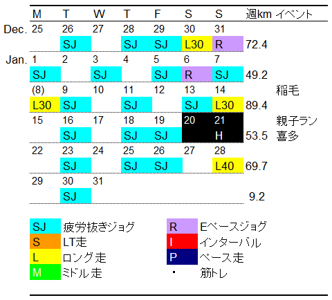 仕事始めが9日からだったのでいつもより数回多いのと、30km走の前後にアップとクールダウンを入れるようにしたので、若干増えた。