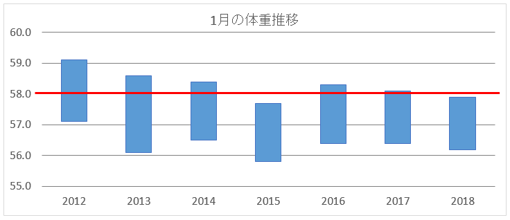 毎年1月は体重が増えてしまうが、今年は禁断区域の58kgに一度も踏み入れることなくコントロールできたemoji