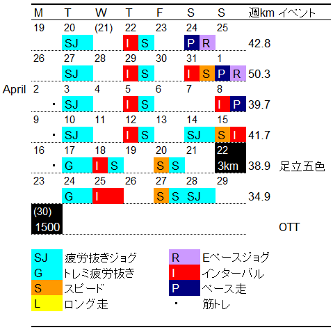 スピード強化期間として3月中旬にインターバルを再開して以来、1kmを5本というオーソドックスなスタイルに加え、距離や本数を変えて取り組んだ。