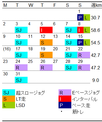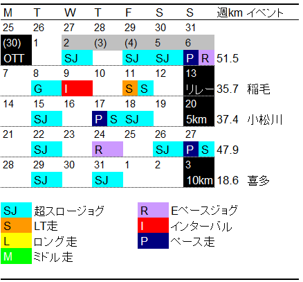 でも、内容はいつもと変わり映えせず、水色の「SJ」、7'00~7'30の1時間疲労抜きジョグ、約9kmが中心。これが僕のやり方。