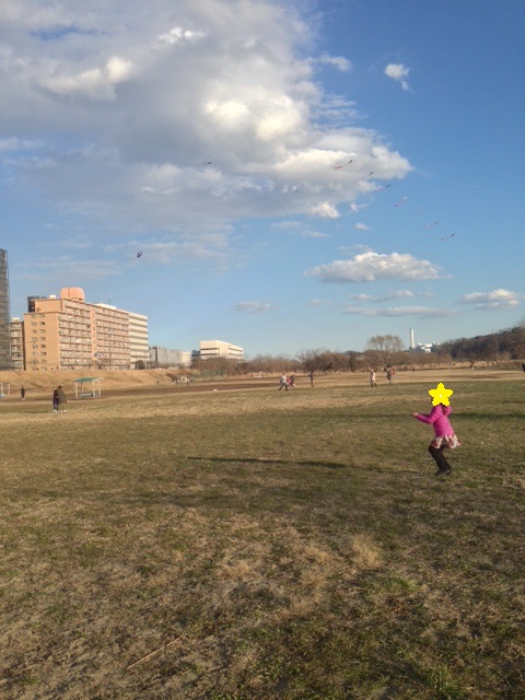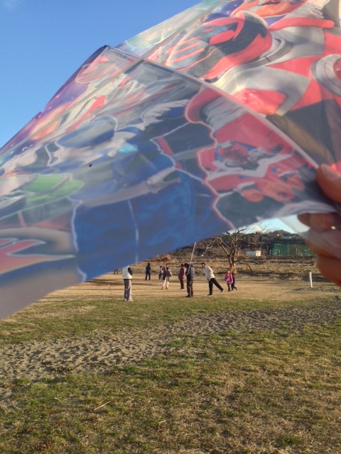 ひとしきり飲んだ後は、近くの河原に行き、凧揚げ。息子が大好きな、なんとかジャー(トッキュウジャー?キューレンジャーー?、いっぱい種類があって忘れたw)。
