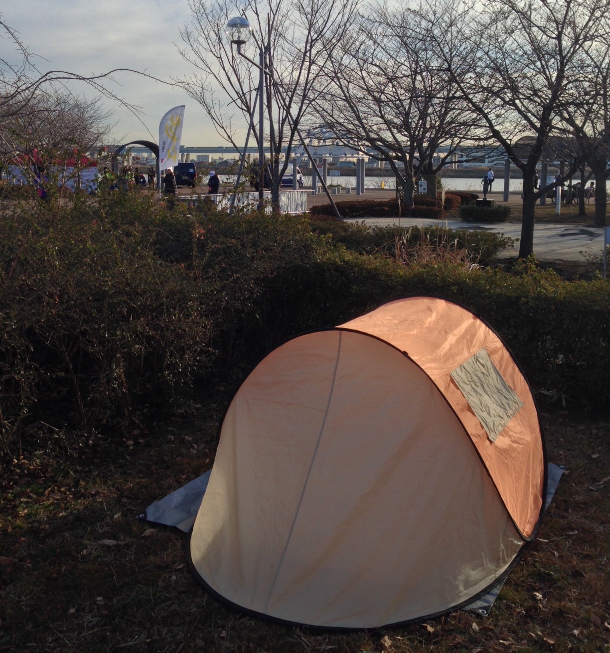 スタート30分ぐらい前。念のためもう一度トイレに行っておこうとするも、さすがに大行列で、踵を返してテントに戻ってきた時だった。