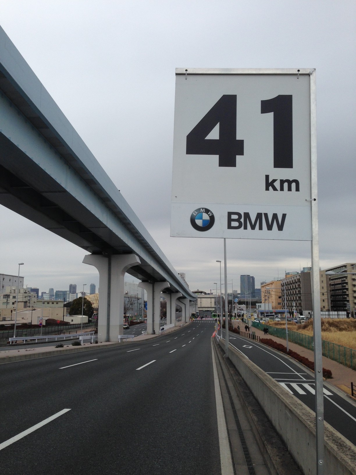 そう、この41km地点は、有明駅に向かう上り坂の途中にあり、歩道がないので沿道の応援もゼロという、寂しい場所。よりによってどんより曇りときたもんだ。