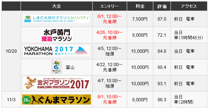 色々検討した結果、やはり抽選の大会は避けたい。ということで、横浜、金沢は除外。